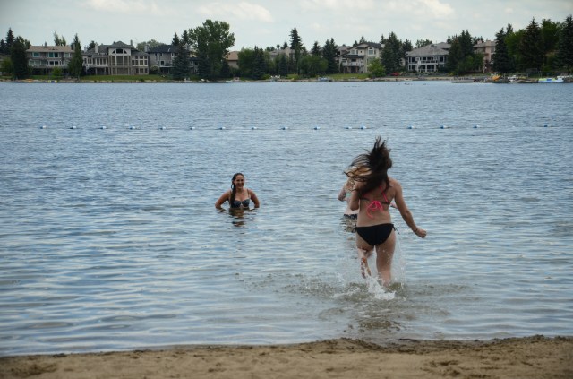 The next morning we enjoyed heading out to enjoy one of the 185 free pancake breakfasts held around Calgary to celebrate the Stampede! We headed down to the private community lake and took our spot in a very long line to wait for our free pancake breakfast. Our new friends Ronja & Minako held our places in line so Jacqueline could take us up to the man made waterfall filter for the lake. What a beautiful place it is for the whole community to enjoy with a toboggan hill for the winter and things to hire our like paddle boats, wind surfing and stand up paddle boarding for the summer as well as being able to fish the man made lake.
